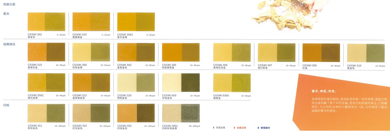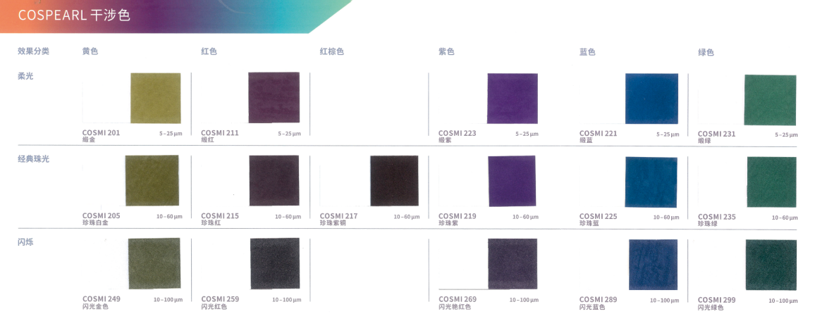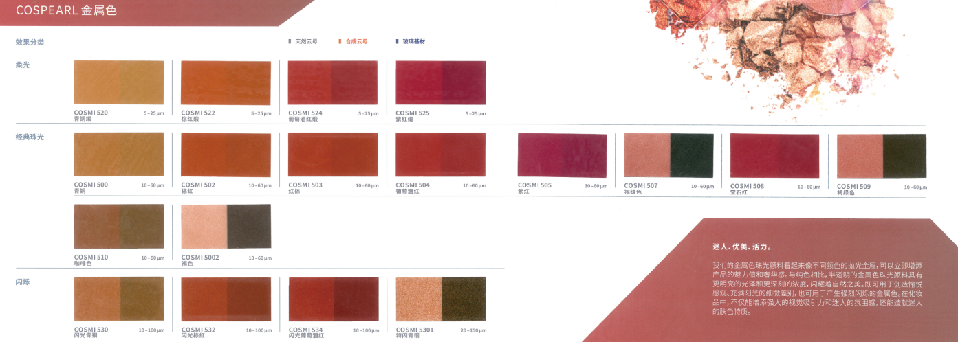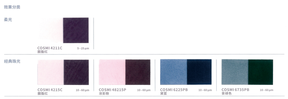 CosPearl 是我们以天然云母为基材的标准产品系列,色彩范围广,可应用于彩妆和个护产品。云母薄片包覆金属氧化物,如二氧化钛或氧化铁。通过光的折射、反射和干涉产生独特的光泽和色彩效果,包括银白色和彩色珠光,以及金色和闪烁的金属色效果。同时,虹彩系列也使依赖角度而变化的色彩设计成为可能。根据珠光颜料粒径的不同大小,效果从丝绒哑光到璀璨闪光不等。这就意味着粒径大小也会影响遮盖率,产品的粒径越细遮盖越好,反之,粒径越大遮盖就越透。此系列适合用于天然化妆品,能让成品具有典型的珠光效果。CosPear 易于混合,几乎可以为每一种应用增添闪亮和光泽。